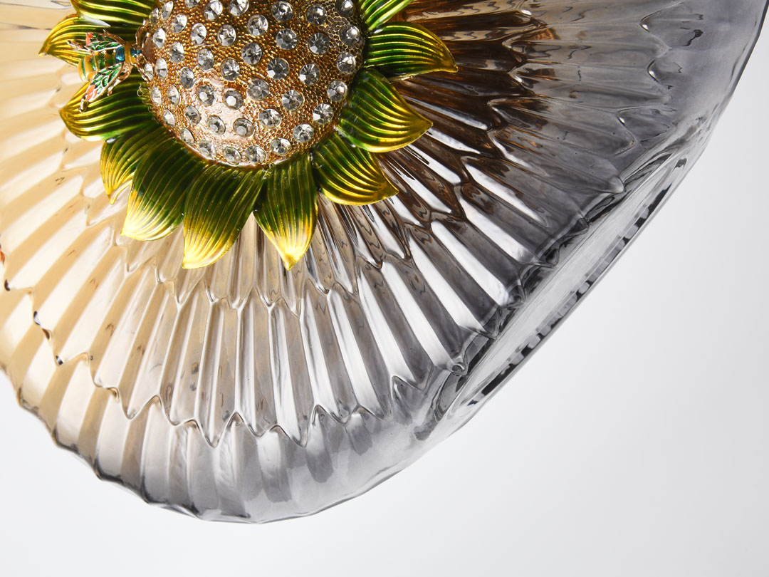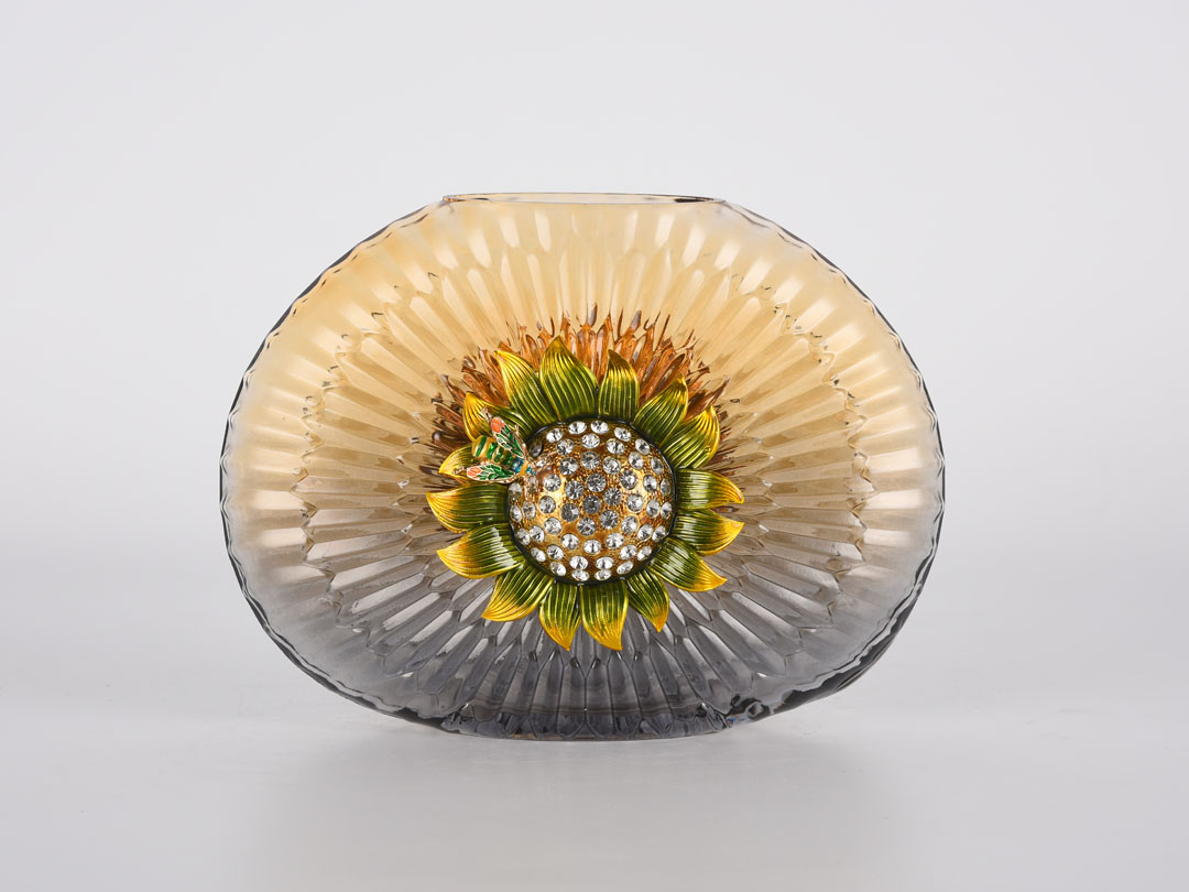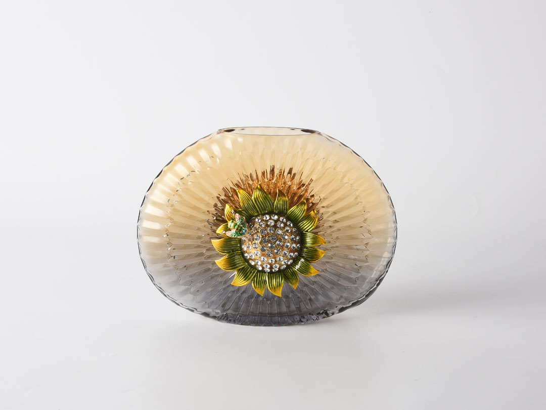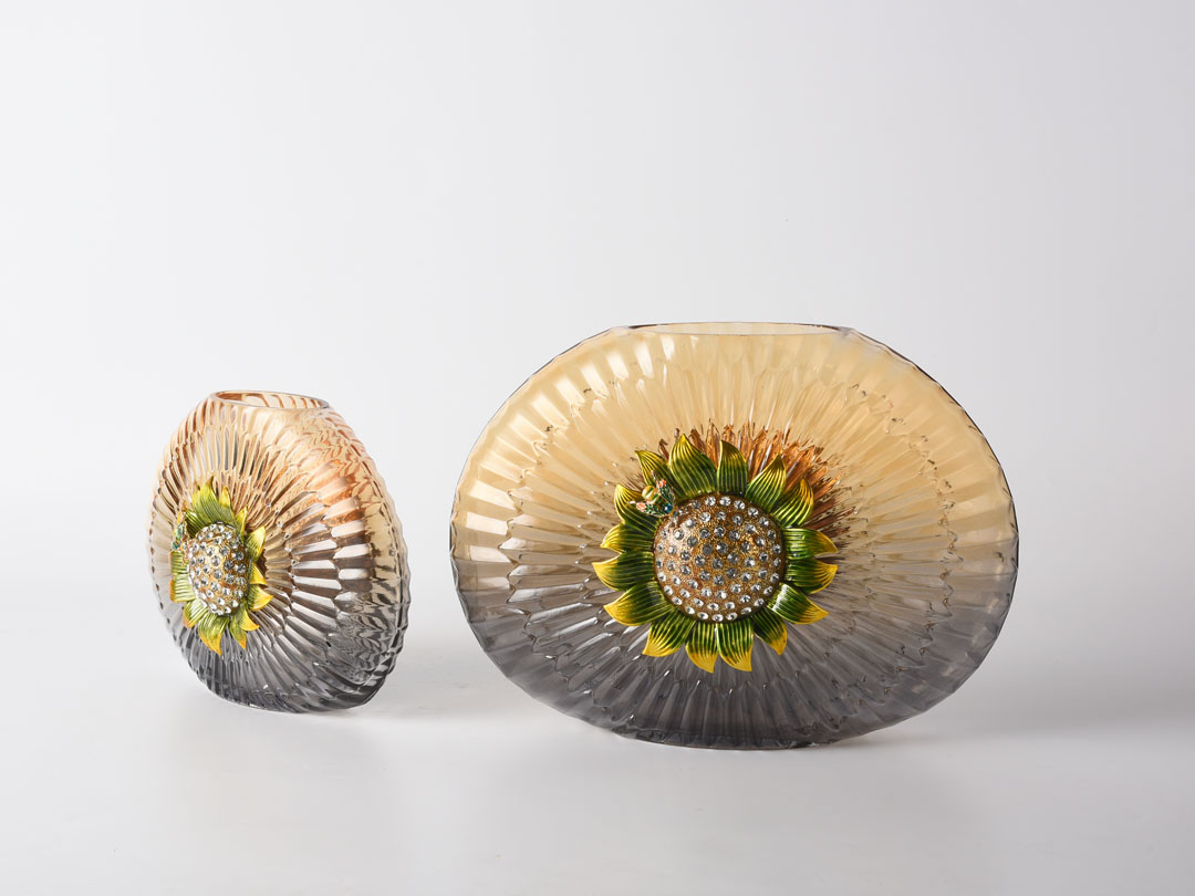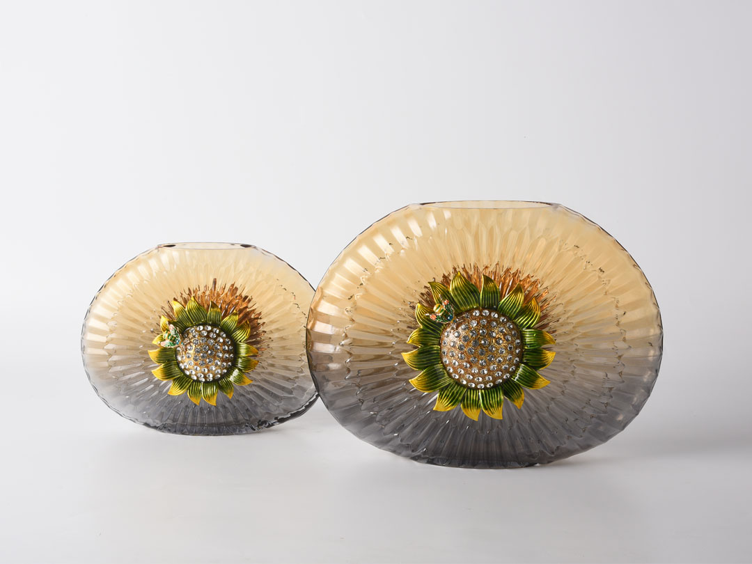 U kunt er zeker van zijn dat u op maat gemaakte Rundecor Elliptical Amber Glass Vase Decor bij ons koopt. Het ontwerp is geïnspireerd op zonnebloemen met heldere en stralende afbeeldingen, bloeiende zonnebloemen, het betekent een bumperoogst. Bijen vliegen over de bloemenbak, verzamelen honing en schenken zoete levens en goede wensen voor eeuwig geluk.